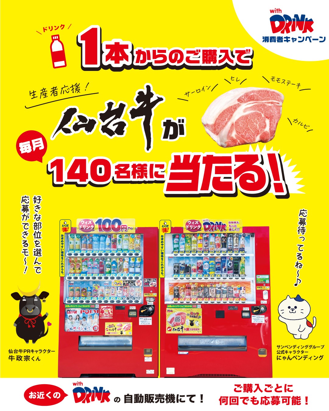 仙台牛があたる!自販機キャンペーンはこちら⇩