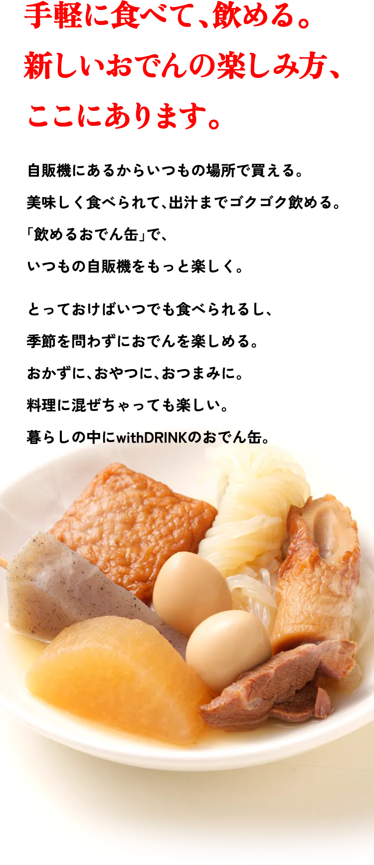 ●品名 おでん●原材料名 こんにゃく(国内製造、中国製造)、大根、うずら卵、調味液[たん白加水分解物、だし抽出液(かつお削りぶし、焼きあご、昆布)、砂糖、還元水あめ、食塩、酵母エキス]、ちくわ、さつまあげ、牛肉、食塩/ソルビトール、香辛料抽出物、調味料(アミノ酸等)、加工デンプン、乳化剤、水酸化Ca、(一部に小麦・卵・牛肉・大豆を含む)●内容量 280g●賞味期限缶底に記載●販売者 株式会社サン・ベンディング東北宮城県仙台市宮城野区福田町南2丁目3-50●製造所 天狗缶詰株式会社 愛知県豊川市白鳥町原溝28-1