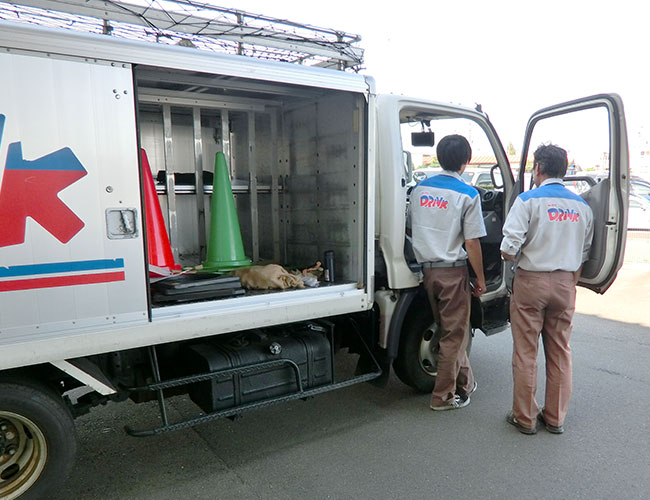 管理部車両課のスタッフが、新入社員に運転マナー指導・交通安全のビデオ講習などを行います。